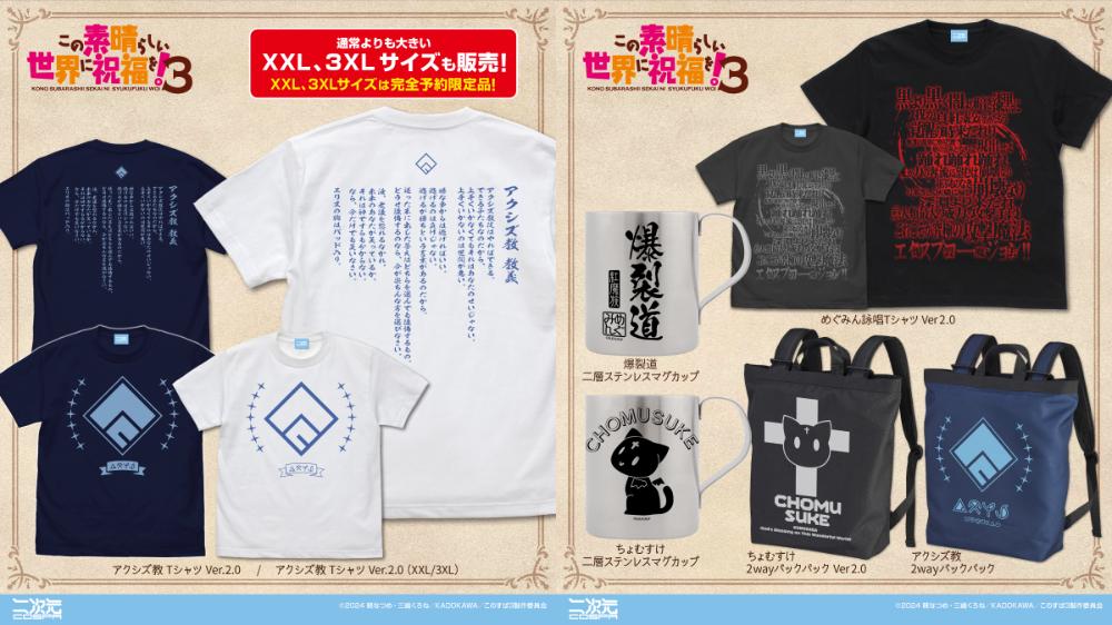 『この素晴らしい世界に祝福を!3』より、「めぐみん詠唱」Tシャツ、「アクシズ教」Tシャツ、2wayバックパック、「爆裂道」「ちょむすけ」二層ステンレスマグカップなどが二次元コスパから登場。