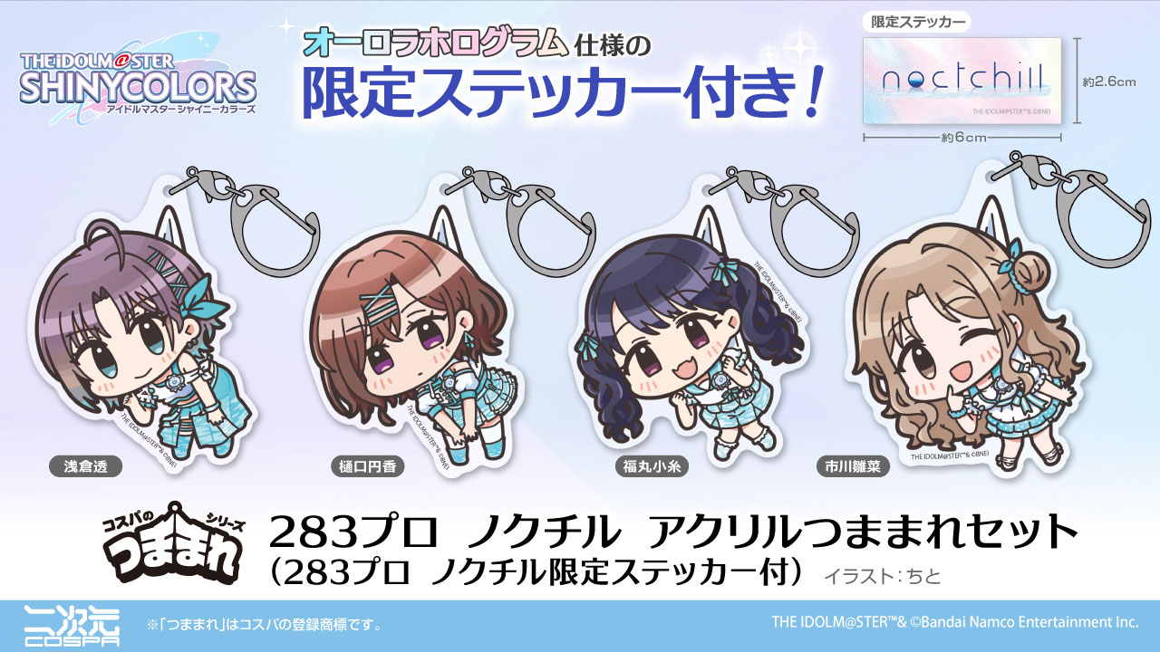 このセットだけのオーロラホログラム仕様の限定ステッカーと、浅倉 透・樋口 円香・福丸 小糸・市川 雛菜 「ノクチル」の4人のつままれがセットになった「283プロ ノクチル アクリルつままれセット(283プロ ノクチル限定ステッカー付)」が二次元コスパから登場です。
