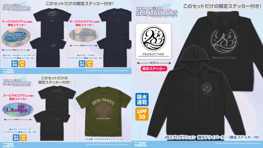 限定ステッカー付の「★限定★283プロダクション 薄手ドライパーカー(限定ステッカー付)」やイルミネーションスターズ、ノクチル、アンティーカの「★限定★ドライTシャツ(限定ステッカー付)」をはじめ、「デビ太郎 エクササイズキャンプ Tシャツ」のスポーツフェスティバルにぴったりな5アイテムです。