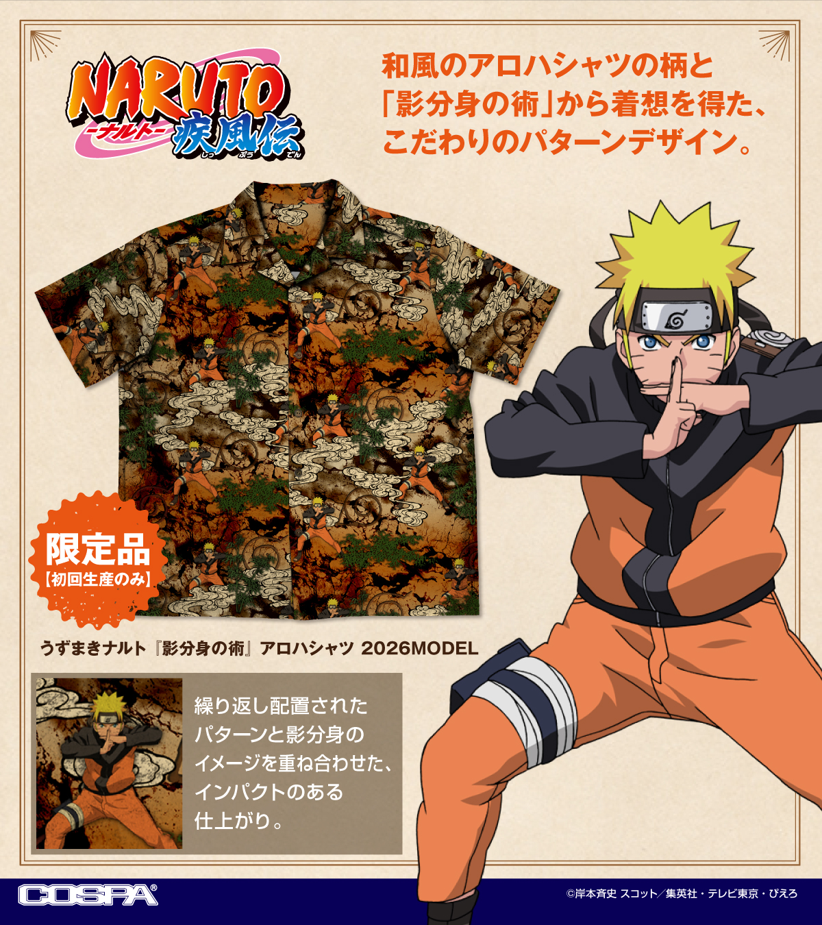 TVアニメ『NARUTO-ナルト- 疾風伝』より、和風のアロハシャツの柄と「影分身の術」から着想を得た、こだわりのパターンデザインのアロハシャツがCOSPA(コスパ)から登場!